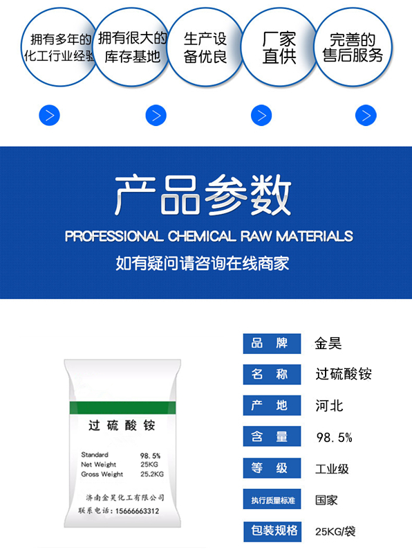過硫酸銨是一種無(wú)色結(jié)晶體,具有較強(qiáng)的氧化性和腐蝕性,常用于有機(jī)化學(xué)合成、漂白劑、引發(fā)劑等領(lǐng)域。以下是其基本信息介紹:化學(xué)式:NH4S2O8分子量:228.20外觀:無(wú)色晶體或白色粉末密度:1.98g/cm?熔點(diǎn):170°C(338°F;443K)沸點(diǎn):不適用溶解性:易溶于水和甲醇,微溶于乙醇和乙醚主要用途:1.用作有機(jī)合成的氧化劑和引發(fā)劑,例如丙烯酸酯聚合、乙烯聚合等。2.用作漂白劑,在紙張、化纖、食品和化妝品等行業(yè)的漂白過程中發(fā)揮作用。3.用作脫水、脫羥基、脫氧等反應(yīng)的催化劑。4.用于制備其他化學(xué)品,如過硫酸銨銅、過硫酸銨鐵等。過硫酸銨是一種危險(xiǎn)品,具有較強(qiáng)的氧化性和腐蝕性,因此在使用和運(yùn)輸時(shí)需要注意。